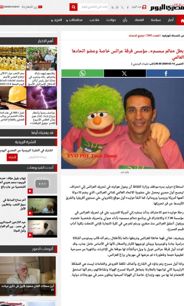 Television interviewsPeofreeDecember 14, 2023Television interviews A television interview on the Nile Cultural Channel with the artist Walid Badr about all of his works in puppetry. Prepared by: ... Read More